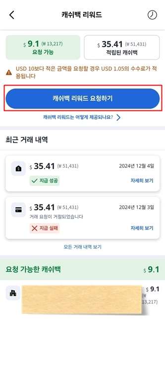 3. 요청 가능 금액 확인 후, "캐쉬백 리워드 요청하기" 버튼 클릭