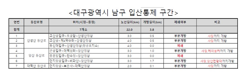 ※ 현재 중구, 북구는 입산 통제 관련 자료 미공시 상태입니다.